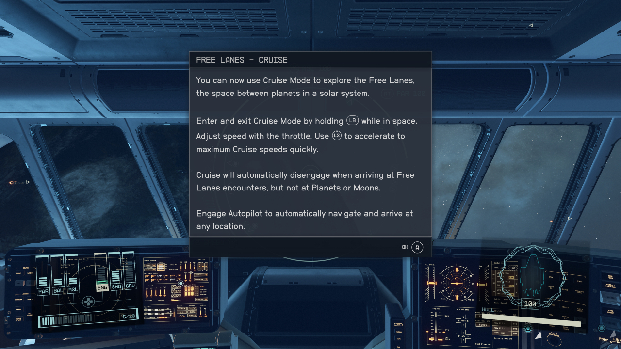 I started with the Free Lanes update, which adds a number of new features and quality-of-life fixes to the game, but its biggest draw is the fact that you can now fly your ship from one planet to another. In practice, this is painfully boring. It’s a neat option if you’re really, really into role-playing, but since you still cannot manually land on a planet from space, its impact is dulled. The real star of the show here is Cruise Mode, which allows you to fly from one planet to another via autopilot.