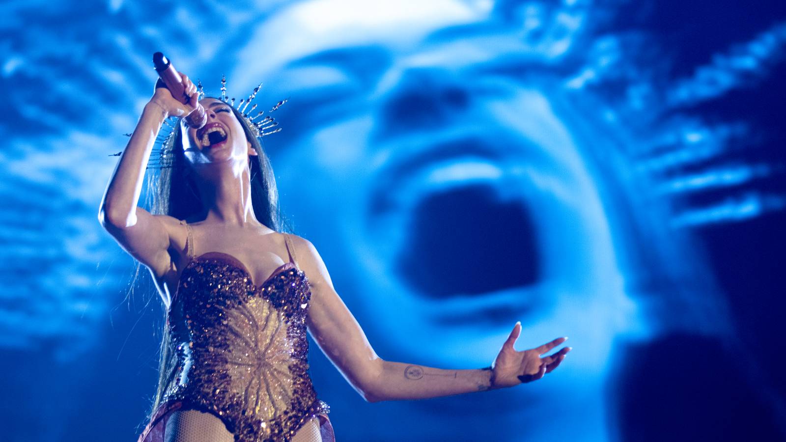Every single bit of that was real. Annie was really up on that platform rising up above the crowd, and we had a camera mounted up there with her. It was incredible to behold. We were shooting the wide shots first, where we got to be a little bit more objective and just thrilled by the spectacle of it. But then when we put the camera up on the platform with her to get the closeups, to see the emotional journey she’s going on as she rises up away from the adoring fans into this liminal space that you can’t quite define up in the darkness, up in the rafters, it was a reminder of what the scene was actually about. Anne knew this was a performance that was very public and she had to give it her all, but that there was something very intensely private happening at the same time.